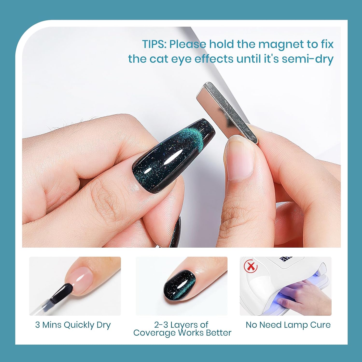 - Important Tips: 1. When the nail polish is not dry yet, it will be fluid. Use magnets to hold it in place until it's semi-dry, then take them off for a sharp cat-eye look 2. Do not touch water or hit the nail surface within two hours after finishing to avoid peeling; 3. Base and top coat nail polish art necessary