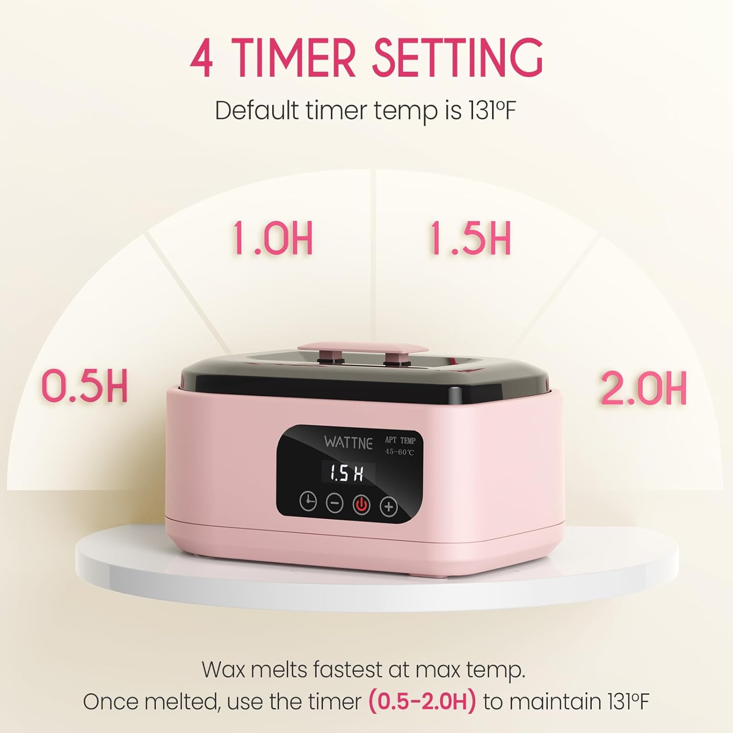 - 4 Smart Timer Settings + keep-warm mode: Our auto-shut off timer lets you set sessions for 0.5H/1H/1.5H/2H. The keep-warm function maintains your desired temperature, so wax stays melted without reheating, Perfect for multi-step treatments or salon use