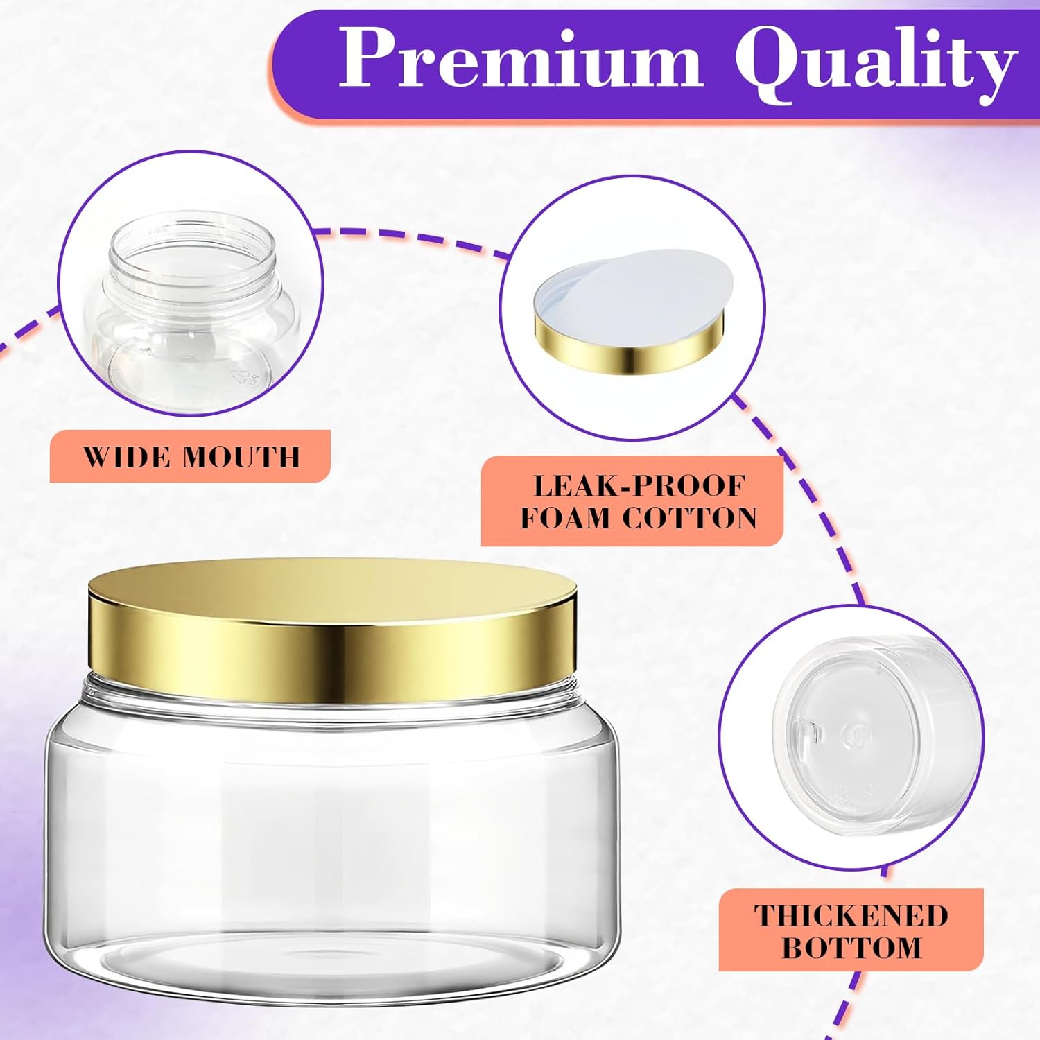 36 Pack 8 oz Plastic Cosmetic Containers With Lids Refillable Clear Empty Travle Jars Containers for Body Butter,Sugar Scrubs,Cream,Lotions,Candy, Waterproof Label&Spatulas - (Gold)