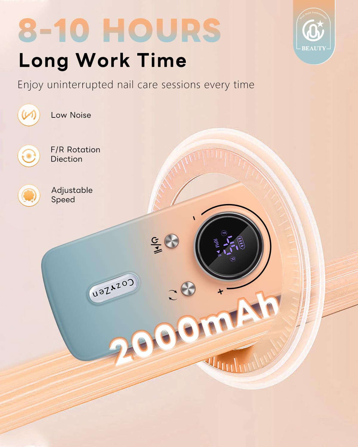 CozyZen Cordless Nail Drill Professional: 45000 RPM Rechargeable Electric Nail File Kit, Portable & Low Noise for Acrylic, Gel Nails, Manicure & Pedicure - Salon & Home Use