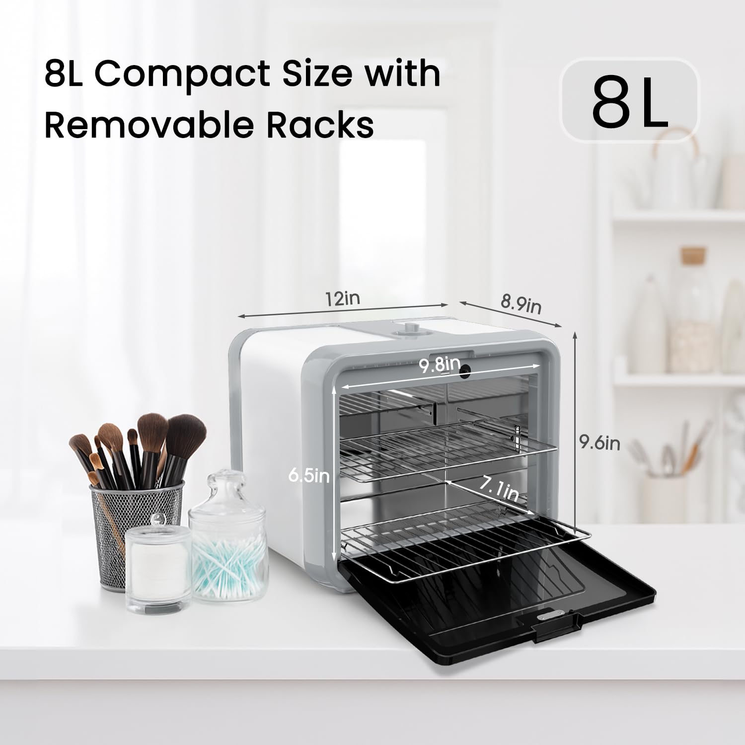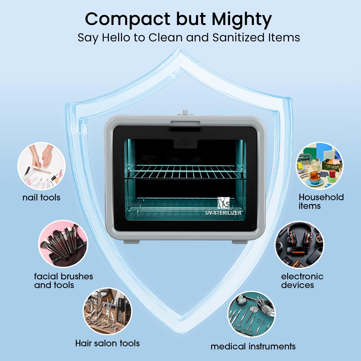 - Compact Size: The UV cabinet has 8L capacity, which doesn't take up a lot of space for your home or business. The two removable trays allows you to disinfects more items at one time
