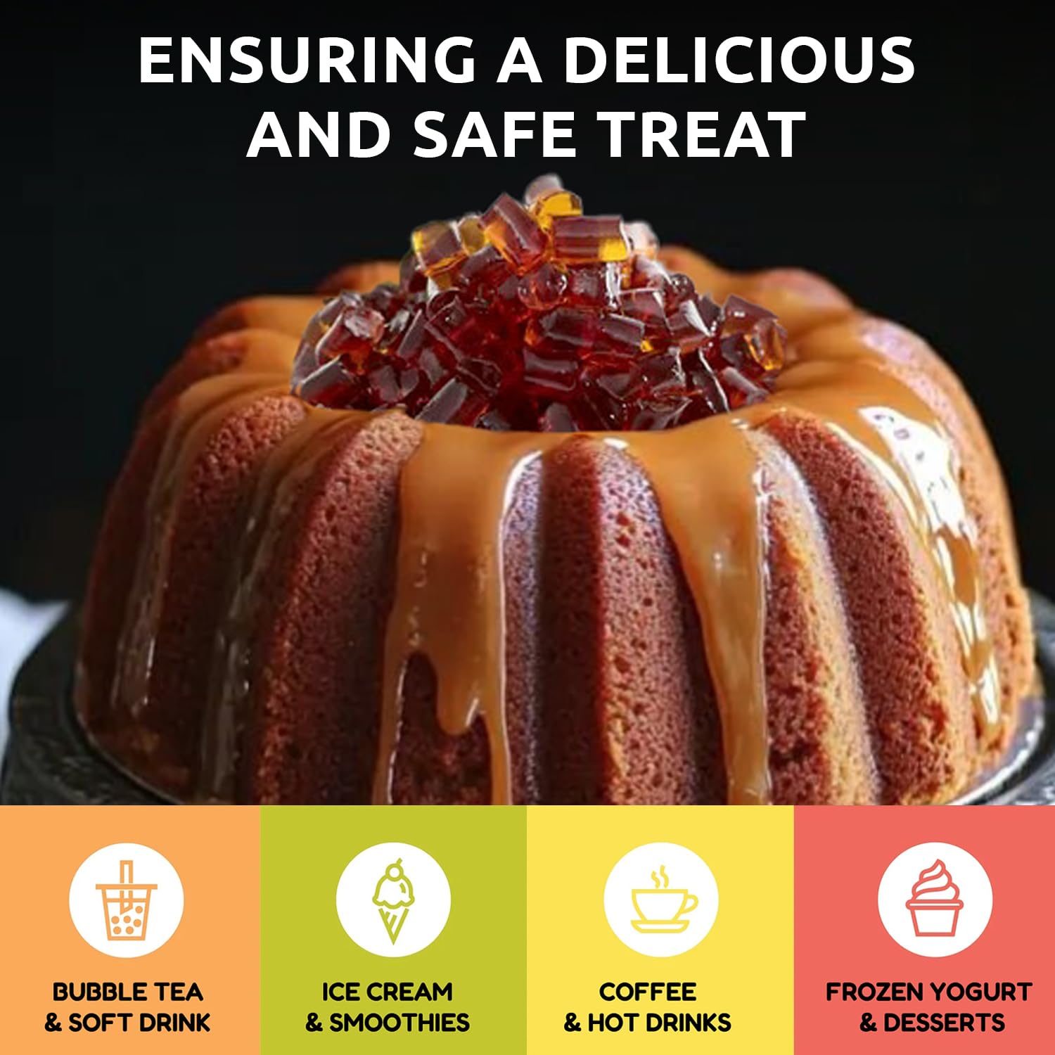 - ๐๐๐ซ๐ฌ๐๐ญ๐ข๐ฅ๐ ๐๐ฌ๐:This boba tea jelly topping can be used in desserts like puddings, cakes, or tropical-themed pastries. It is also suitable for cocktails or mocktails, adding a unique texture and flavor to beverages and allowing chefs to experiment by using it as a base for creating innovative recipes