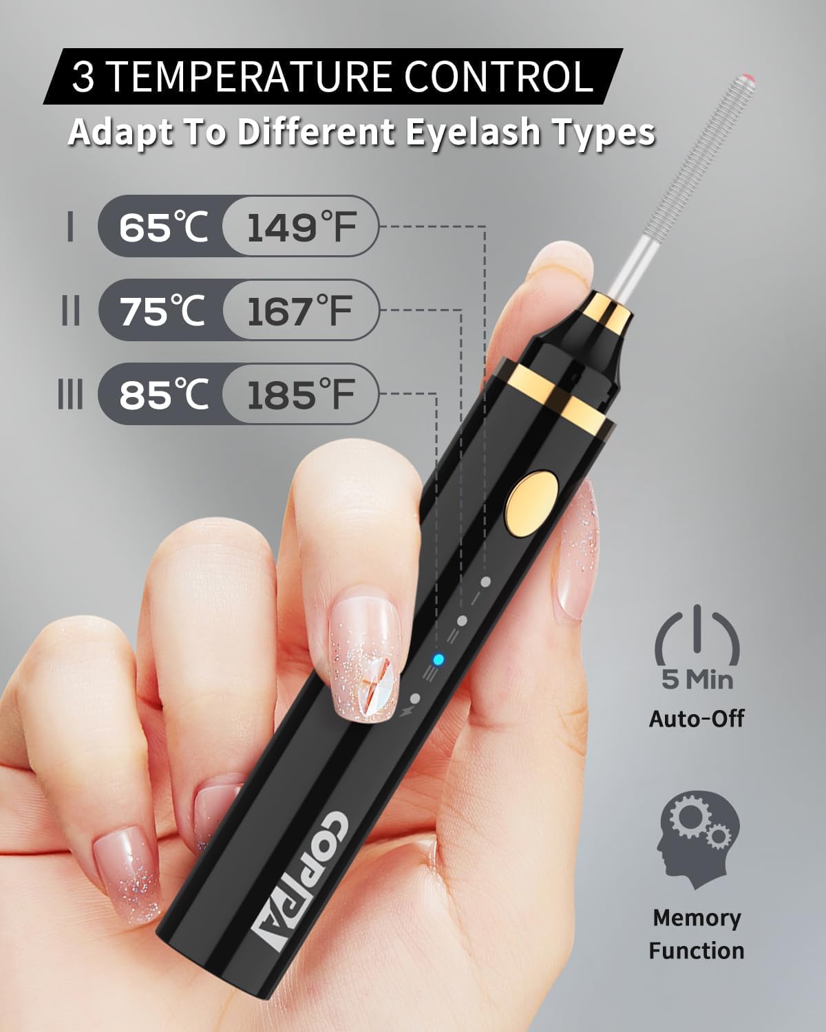 COPPA Electric Lash Curler, LP-1 Lipstick Type 3-in-1 Heated Eyelash Curler with 3 Brush Heads 3 Curling Modes and 3 Temp & 5s Quick Heat-up, Perfect for Beginners and Makeup Pros, Black